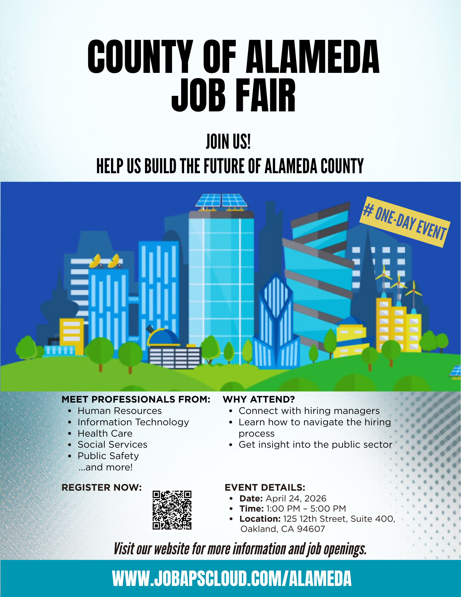 Join us at the County of Alameda Job Fair and you'll have the opportunity to meet with professionals from a variety of fields, including Human Resources, Information Technology, Health Care, Social Services, Public Safety, Engineering, skilled trades and more!