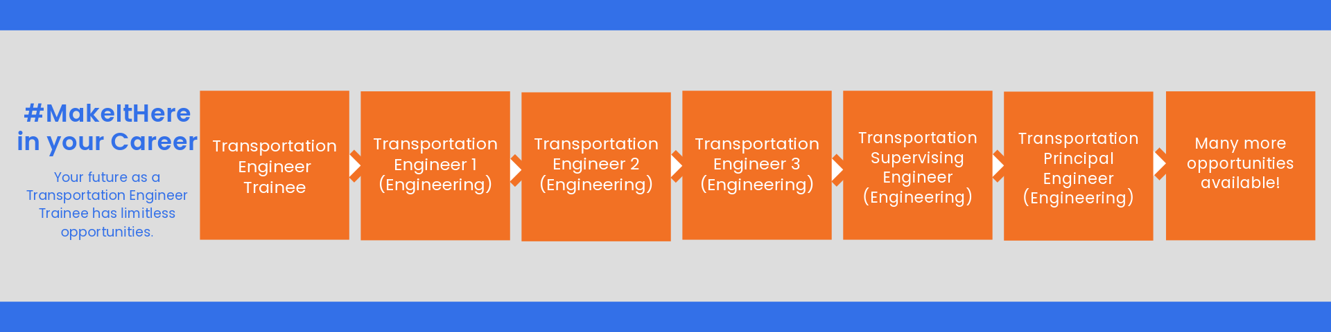 Transportation Engineer 1 (Engineering). The target class has a minimum qualification of a Bachelor’s degree in Engineering and one (1) year of experience in transportation engineering or transportation construction engineering. After successfully completing two years as a Transportation Engineer 1, you will be promoted to