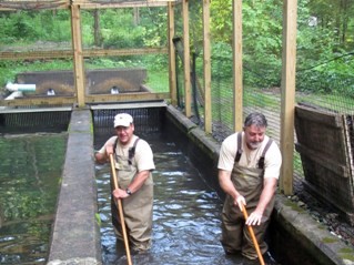 One unique fish culture project is the Brown Trout “Survivor” Program. It is intended to produce a strain of fish that is better suited to survive in the wild. Ideally the "Survivor" strain will behave like a wild trout, will be more temperature tolerant, will have better avian predator avoidance and will readily reproduce. Annually, the Fisheries Staff collects fish from the West Branch Farmington River that have survived for more than one year and each fall transfer these fish to the Burlington facility to be used as brood stock. The offspring of these fish are returned to the West Branch Farmington River to grow and spawn thus increasing the number of "Wild" Brown Trout in the river. While research continues on the effectiveness of the program, the initial information indicates the program is working. Prior to these efforts there were few “Wild” Brown Trout in the West Branch Farmington River. Now "Wild" Brown Trout catches are commonplace.Unique hatchery improvements have been put in place to protect fish growing in the outside ponds. Fencing and overhead netting has reduced predation and increased the number of fish available for stocking while providing easy access.