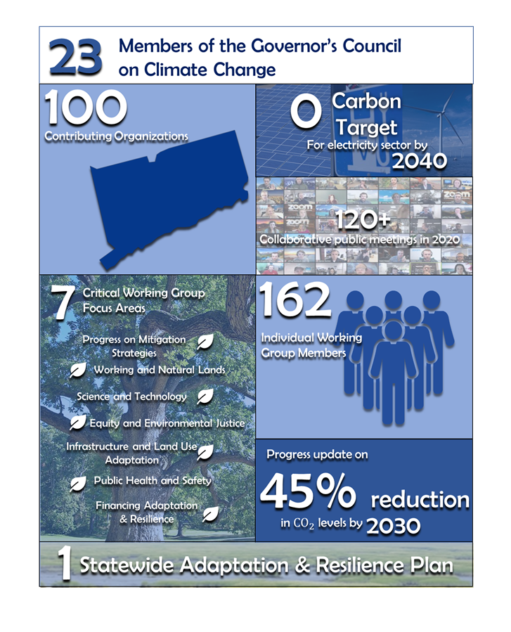 - Conduct planning and make policy recommendations addressing the impacts of climate change and how Connecticut may become more resilient to them through adaptation interventions, preparedness, and recovery programs. Programs will include, but not be limited to, policy and planning for utility (water or energy) and electric grid resilience; identifying nature-based or green infrastructure solutions to climate adaptation; and prioritizing the protection of vulnerable communities disproportionately impacted by the effects of climate change with a focus on equity and environmental justice.