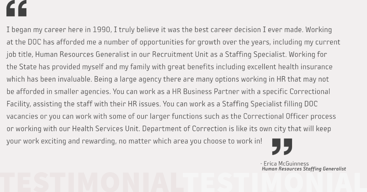 As an HR professional at the DOC you play a key role in the engagement and support of this incredible group of about 6,000 correctional professionals. There is little in the world of HR that you will not encounter on a regular basis at DOC. Our size is one of our strengths when it comes to developing our HR team. The breadth and scope of your work provides a wide array of opportunity for professional growth!