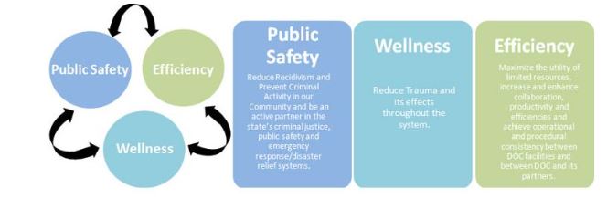 The CT DOC shall strive to be a global leader in progressive correctional practices and partnered re-entry initiatives to support responsive evidence-based practices aligned to law abiding and accountable behaviors. Safety and security shall be a priority component of this responsibility as it pertains to staff, victims, citizens and offenders.