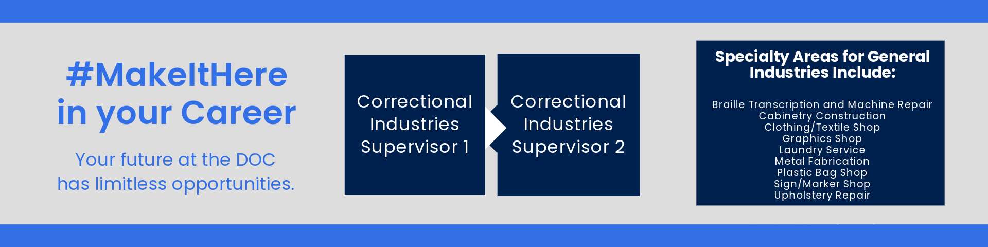 The State of Connecticut, Department of Correction (DOC), has an opening for a Correctional Industries Supervisor 1 (General Industries) position at MacDougall-Walker Correctional Institution in Suffield, CT. This hazardous duty position is located with the Metal Shop responsible for producing products such as picnic table frames, aluminum signpost frames, plow pins, sign and cone holders, pre-warning sign frames, heil dump conveyers, pipe gates, Commissary carts, wing carts, truck boxes, metal silverware holders and many more interesting projects!