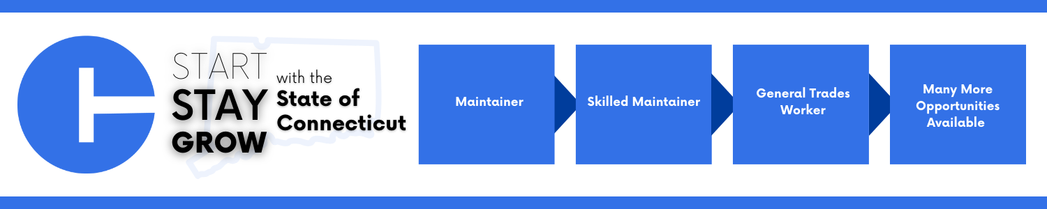 This image shows a career progression pathway within the State of Connecticut: starting with Maintainer, advancing to Skilled Maintainer, then General Trades Worker, and ending with “Many More Opportunities Available.”