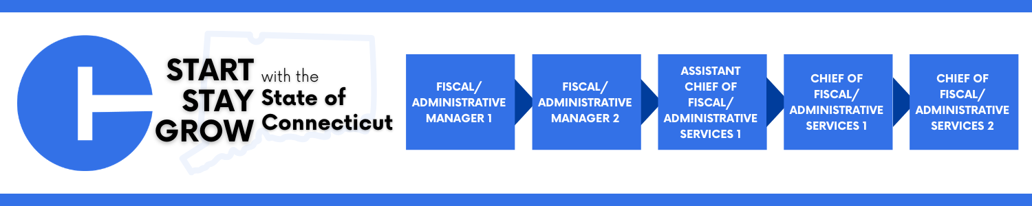 Career progression within the State of Connecticut: starting with Fiscal/Administrative Manager 1, advancing to Fiscal/Administrative Manager 2, then Assistant Chief of Fiscal/Administrative Services 1, then Chief of Fiscal/Administrative Services 1, and ending at Chief of Fiscal/Administrative Services 2.