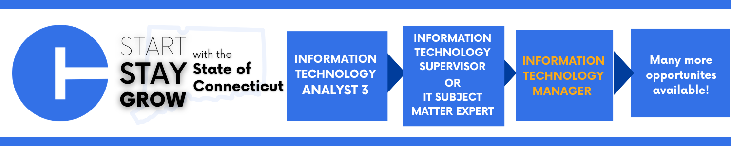 This image shows a career progression pathway within the State of Connecticut: Starting with Information Technology Analyst 3, advancing to Information Technology Supervisor or IT Subject Matter Expert, with a focus on with Information Technology Manager, ending with "Many more opportunities available!".
