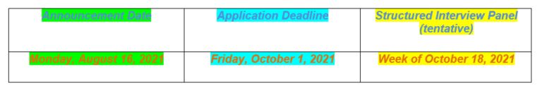 IMPORTANT NOTE: The structured interview panel is tentatively scheduled for the week of October 18, 2021; times and location to be announced. The apprenticeship is anticipated to start the week of November 15, 2021.