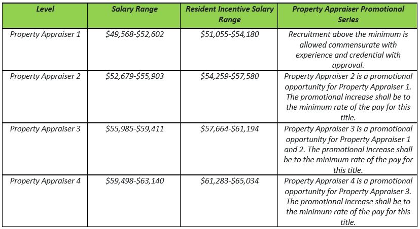 The current salary range for Property Appraiser 1 (Pay Range 2DN) is $49,568-$52,602 annually, and the resident incentive salary for City of Milwaukee residents is $51,055-$54,180 annually. Recruitment is at the Property Appraiser 1 level however, placement above the minimum of the footnoted Property Appraiser 1 salary range is allowed commensurate with experience and credentials with approval.