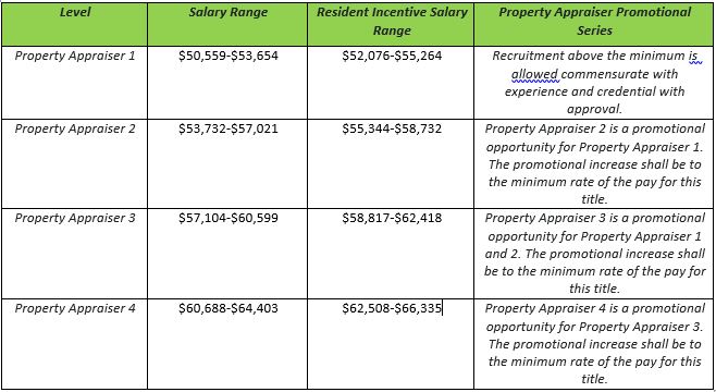 The current salary range for Property Appraiser 1 (Pay Range 2DN) is $49,568-$52,602 annually, and the resident incentive salary for City of Milwaukee residents is $51,055-$54,180 annually. Recruitment is at the Property Appraiser 1 level however, placement above the minimum of the footnoted Property Appraiser 1 salary range is allowed commensurate with experience and credentials with approval.