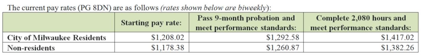 This is a continuous recruitment. Applications will be accepted and interviews held during 2019 as often as required to meet the needs of the City. Qualified applicants will be notified by email of the date, time and place of the examination. Unless otherwise required by law, the City of Milwaukee will not provide alternative test administration. The applicant is responsible for attending all phases of the job selection process at the time and place designated by the City of Milwaukee. Employment may be possible immediately following the examination if positions are vacant at that time. The names of successful candidates will be placed on the eligible list in a rank determined by the final grade without reference to the date of the examination. The names of candidates who pass all phases of the selection process may remain on an eligible list resulting from a continuous examination for up to six months.