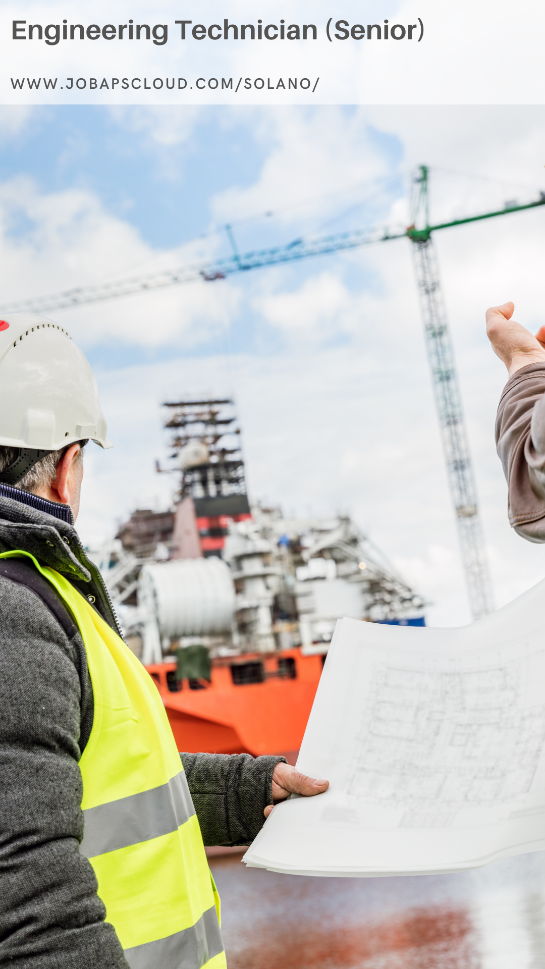Please visit the County of Solano website, www.jobsatsolanocounty.com, to apply. Applications must be submitted through the JobAps system. Paper copies of applications are not accepted. All additional application materials as requested in the job announcement (degree/transcripts, certificates, DD-214 if applicable, ADA Accommodation Request) must be submitted by fax to (707) 784-3424, or by email to recruitment@solanocounty.com. Be sure to include the recruitment title (Engineering Technician (Senior)) and the recruitment number (21-474010-01) in your email or fax, and are due by the final filing date.