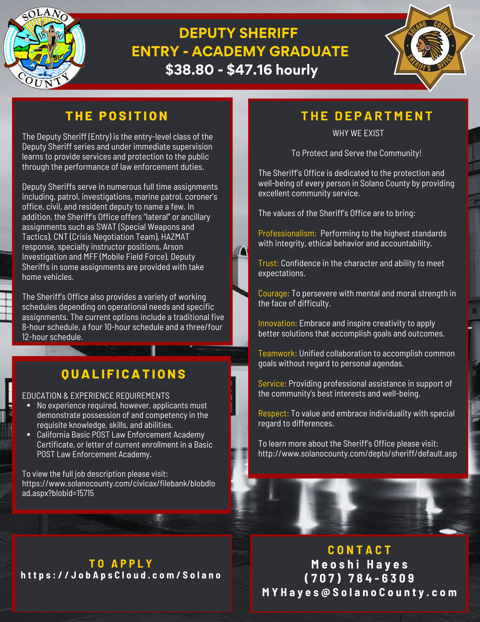 In addition to uploading attachments when applying online, candidates may submit documents by fax to (707) 784-3424, or by email to recruitment@solanocounty.com. Be sure to include the recruitment title Deputy Sheriff (Entry-Academy Graduate)) and the recruitment number (22-512030-01) in your email or fax.